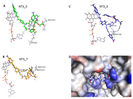 - Interactions induced by the triazole linker: We chose a triazole linker between the chromophore and the nucleotide (Figure 1) for its ease of generation by click chemistry [16,18]. The triazole was relatively rigid and participated in NT3_5 binding to NOS, as shown in Figure 3C. Extended stacking interactions were observed in NT3_5 between the triazole ring, the adenine ring, and P1014 that formed an “hydrophobic hub”. To adapt and contributing to this hydrophobic hub, one chromophore phenyl ring was somewhat twisted with respect to the first phenyl-NH2 moiety. This hub was further stabilized by I1018 and L1164, F1160 from the other side. In addition, R776 interacted with both the triazole and the benzoate ring and carboxylate group of hook1. In contrast, in NT3_7, the conformation of the triazole ribose was rather extended, the adenine being weakly stabilized by M1119. In NT3_3, the conformation of the triazole ribose was also rather extended. The adenine showed hydrophobic interactions with P1014 and L1164, as well as cation-π interaction with R1165.