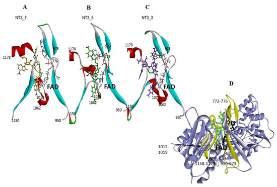 - Protein-induced fit to NT3_5 binding conformation: Figure 3C shows that strong interactions between the triazole, the last phenyl ring of the chromophore, and the adenine ring contributed to stabilize NT3_5 in its binding pocket. This hydrophobic “hub”, only found in NT3_5, required the protein to adapt, with a β sheet (950–973) being pushed apart from a linker (1012–1019). The distance between A958 and T1016 thus increased to 9.5 Ǻ as compared to the same distance in NT3_3 and NT3_7 (6 and 8 Ǻ, respectively) (Figure 4 and Figure A4). The differences in interactions at the level of the ribose carboxylate and of the triazole–chromophore–adenine dictated the orientation of the chromophore and its ability to stack with the isoalloxazine ring of FAD. Table 2 and Figure 3 show that NT3_5 stacked better with the protein than NT3_7 did. It is likely that these structural features enhanced the ability of NT3_5 to transfer electrons upon light activation, as observed experimentally.