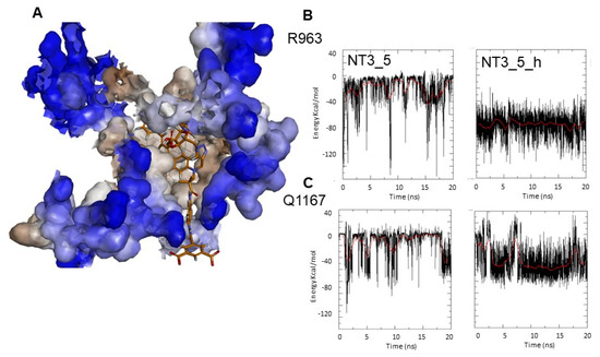 - Gate to the channel of the NADPH site: By inspecting Figure 3D, it is obvious that electrostatic interactions play an important role in the binding of any ligand to that site. The analysis of the dynamics (Figure 4 and Figure A4) shows that two of the three loops that were in the proximity of the NTs in eNOS (772–776 and 1012–1019) together with a β-sheet (950–978) and the C-terminal linker 1158-1178 formed a flexible aperture of the channel. These loops/linker movements guided the initial steps of the binding of the NTs and constituted a “gate keeper” to the channel. Along the entire path of NT binding, hydrophobic interactions guided the NTs to the conserved arginine region where the electrostatic interactions were the strongest. In addition to the electrostatic interactions with conserved arginines of eNOS, the chromophore and the adenine of NT3_5 contribute to binding by hydrophobic or polar contacts (A958, P1014, T1016, G1017, F1160, T1163, Table 2) and cation-π interactions (R776 and R963). The hook 1 in NT3_5 and hook2 in NT3_5h made additional electrostatic and hydrophobic interactions with one of the gate keeper loop (771–776), the β-sheet (950–978) and with C-terminal residues (Q1167) (Figure 5).
