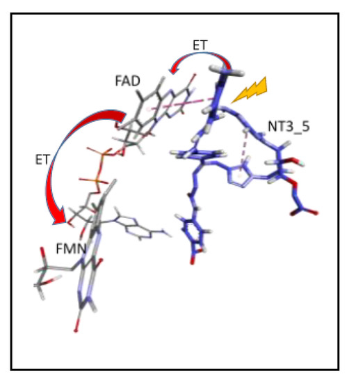 - Electron transfer to e/nNOS (Scheme 1): NT1 and NT3_5 transferred electrons to the protein after light activation, which led to initiation of the electron flow in e/nNOS and experimental detection of NO [12,21]. In contrast, NT3_7, which bears a single carboxylate at the 2’ position, had a smaller interaction energy with eNOS than had NT3_5. NT3_7 chromophore did not stack well on the FAD isoalloxazine ring, suggesting a reduced electron transfer ability in the excited state, in agreement with its parent NT2_7 being unable to generate NO [18,19]. This is in agreement with previous studies on the effect of stacking interactions between flavin derivatives and aromatic hydride-donor model compounds [32]. We also computed the distance between the electron-donating NH2 terminal of the NTs and the electron acceptor FAD at the N5 position. It fluctuated between two levels in the various replica (Supplementary Figure A7): While in NT1, this distance fluctuated between 4.5 and 5.6 Ǻ, the levels ranged between 5.6 and 7.2 Ǻ for NT3_5, 6.2 and 7.5 and 5.7 and 7.7 Ǻ for NT3_3 and NT3_7. Although the distances were shorter for NT1 than NT3_5, favorable entropic (ring–ring) interactions in NT3_5 provided stabilization of the adenine by the first phenyl ring of the chromophore and further interactions with the triazole. Consequently, the two phenyl rings became twisted one with respect to the other. We cannot rule out that the excited state(s) may thus possess some character of a twisted intramolecular charge transfer state (TICT) with a high dipole moment, that would support the ability of NT3_5 or NT2_5 to transfer electrons to FAD. TICT was described for push–pull polyenes and merocyanines [33,34].