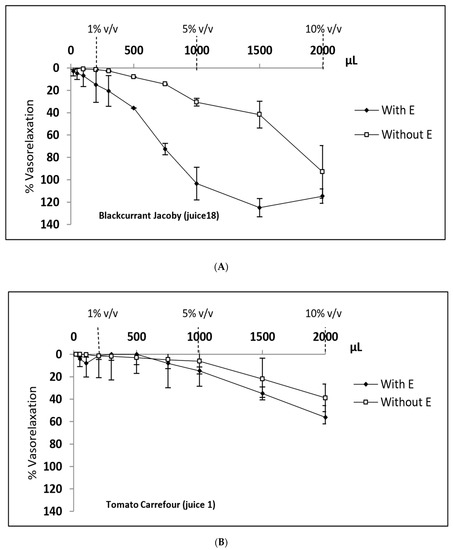 Examples of endothelial vasorelaxation activity in segments of rat aorta according to the volume of either blackcurrant (Jacoby) and Tomato (Carrefour) juices (respectively panels A and B) added to 20 mL initial organ bath solution (OBS). The following Vjuice/VOBS ratios were selected to evaluate the vasorelaxant effect as a function of total or individual concentrations of specific phenolic compounds: 1%, 5%, and 10%. Cumulative volumes of each fruit or vegetable juice were then added to reach a final volume of 2000 µL over a period of 1 h. E = endothelium.