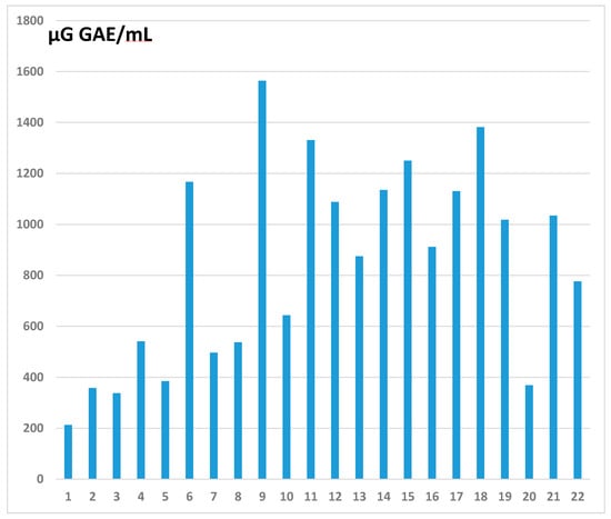 Total polyphenol contents (TPC-J), expressed in µg gallic acid equivalents per milliliter (µg GAE/mL), of 22 commercial vegetable and fruit juices found in Belgian and French markets. GAE: gallic acid equivalents. 1: Tomato (Carrefour), 2: Tomato (Biotta), 3: Carrot (Biotta), 4: Orange d’Espagne (Carrefour), 5: Pure Orange (Vitamont), 6: Lemon (Bonneterre), 7: Grapefruit, 8: Pure Grapefruit (Vitamont), 9: Grape (Materne), 10: Pure Grape (Vitamont), 11: Pomegranate (Biotta), 12: Blackcurrant (Biotta), 13: Blackcurrant (Natreen), 14: Blackcurrant (Jacoby Bio), 15: Blackcurrant (Van Nahmen), 16: Blackcurrant (Schörl Nectar), 17: Blackcurrant (Gut and Günstig), 18: Blackcurrant (Jacoby), 19: Pineapple Juice (Carrefour), 20: Pineapple Juice (De Drie Wilgen), 21: Apple (Carrefour), and 22: Pure Apple (Vitamont).