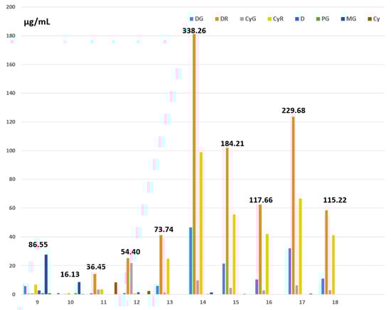 Concentrations of individual anthocyanins (µg/mL) found in 10 commercial red fruit juices. Numbers in bold indicate total anthocyanin concentrations (µg/mL) in the juices. Pet, Pel, P, and M are not represented because of their low to zero concentrations in the juices. 9. Grape Materne (Carrefour), 10. Pure Grape (Vitamont), 11. Pomegranate (Biotta), 12. Blackcurrant (Biotta), 13. Blackcurrant (Natreen), 14. Blackcurrant (Jacoby Bio), 15. Blackcurrant (Van Nahmen), 16. Blackcurrant (Schörl Nectar), 17. Blackcurrant (Gut and Günstig), and 18. Blackcurrant (Jacoby).