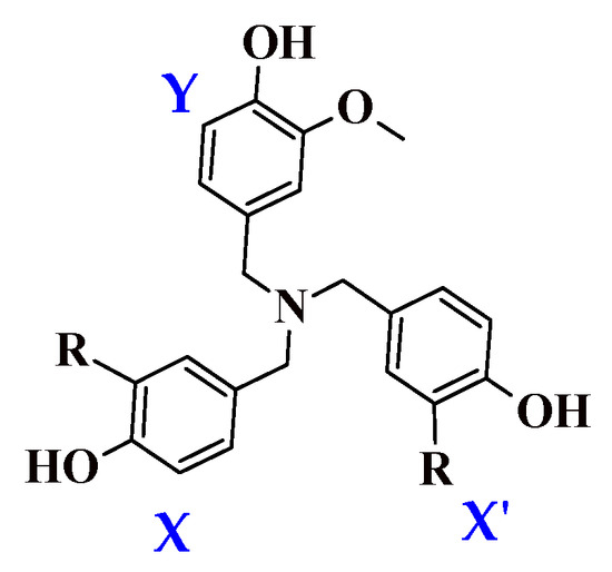General structure of the compounds and notation (X, X’ and Y) for the phenol rings. R = H, electron-donating or electron-withdrawing group.