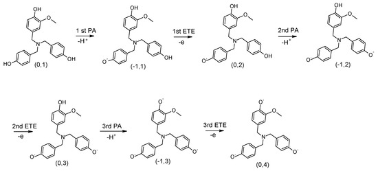 Scheme of the reference compound undergoing consecutive sequential proton loss electron transfer (SPLET) mechanisms. The order was determined based on the computed PA values shown in Table 3. At each step, charge and spin multiplicity of the resulting molecule are indicated in parenthesis (charge, spin multiplicity).