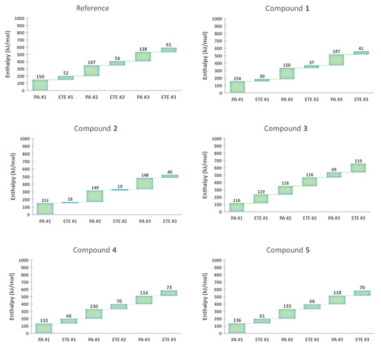 The ΔHcum of each compound, determined by cumulatively adding PA and ETE of all three rings with consideration of the ∆HDPPH• is shown in Figure 5. The overall enthalpy order is compound 2 (523 kJ/mol) < compound 1 (559 kJ/mol) < compound 5 (584 kJ/mol) ≈ compound 4 (585 kJ/mol) < reference compound (594 kJ/mol) < compound 3 (655 kJ/mol).