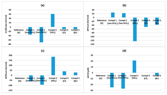 Graphical representation of the enthalpy deviation of each compound from the value of the reference compound: (a) ∆(∆Hcum), (b) ∆PAcum, (c) ∆ETEcum and (d) ∆IC50.