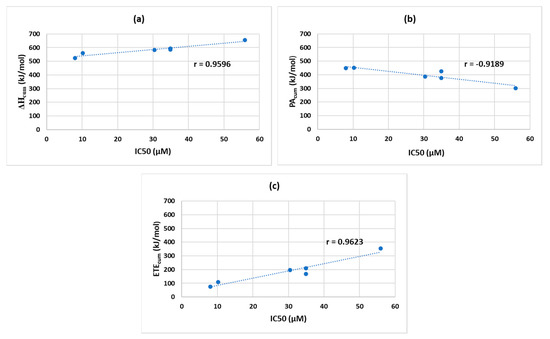 Correlation between IC50 and ∆Hcum (a), IC50 and PAcum (b), and IC50 and ETEcum (c).