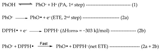Antioxidant action for free radical scavenging can occur in several different ways, but the ultimate outcome is the donation of a hydrogen atom (H•) to the radical. The hydrogen atom transfer can occur in multiple different ways. It can be (1) direct H• atom transfer to radicals, (2) electron transfer, followed by H+ loss, or (3) proton loss, followed by electron transfer. The proposed mechanism for (1) is the hydrogen atom transfer (HAT) mechanism in which the hydrogen atom (H•) is transferred from the phenolic OH to the radical. In the HAT mechanism, the BDE is the most important parameter in estimating the antioxidant activity. The mechanism for (2) is the single electron transfer-proton transfer (SET-PT), in which an electron is first transferred from PhOH to the radical. The PhOH then becomes a phenoxy radical cation (PhOH•+), which in turn deprotonates during the second step to form a phenoxy radical (PhO•). In the SET-PT mechanism, the radical transfer in the 1st step is measured as the ionization potential (IP) and the deprotonation in the 2nd step corresponds to the proton dissociation enthalpy (PDE). The proposed mechanism for (3) is the sequential proton loss electron transfer (SPLET), which also proceeds via two steps. The 1st step involves the deprotonation of PhOH, forming a phenoxide ion (PhO−). Subsequently, the PhO− ion transfers an electron to the radical and becomes a phenoxy radical (PhO•). The enthalpy of the 1st step is denoted as the proton affinity (PA) and the 2nd step corresponds to the electron transfer enthalpy (ETE). HAT has been reported to be the most favorable antioxidant mechanism in non-polar solvents or in gas phase, while SET-PT and SPLET are the more prevalent mechanisms in polar solvents [9,10,11,12,13,14,15]
