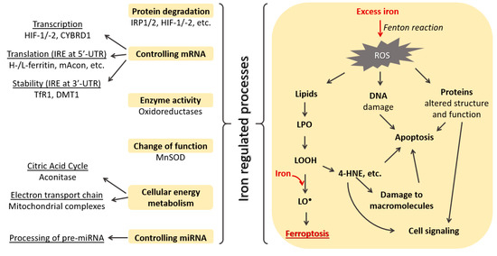 - Casey, J.L.; Koeller, D.M.; Ramin, V.C.; Klausner, R.D.; Harford, J.B. Iron regulation of transferrin receptor mRNA levels requires iron-responsive elements and a rapid turnover determinant in the 3’ untranslated region of the mRNA. EMBO J. 1989, 8, 3693–3699. [Google Scholar] [CrossRef] [PubMed]
