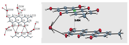Intermolecular interactions in crystal and H-bonds established between water and aromatic hydroxyls (left). Stacking between emodin rings (right); 3.454 Å is the distance between the quinone centroid (green) and its closest C atom belonging to the lower ring.