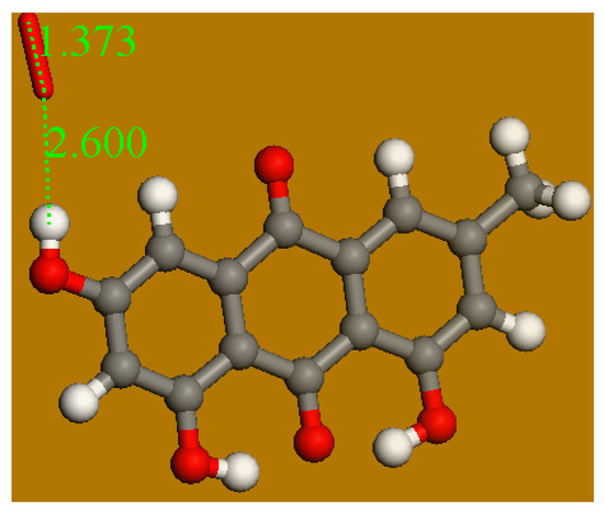 Emodin was recrystallized from an ethanol/water mixture and a molecule of water was incorporated in the crystalline cell. However, we did not use these crystals for CV studies, as the water interferes with superoxide. In fact, we used the commercial anhydrous emodin, and high-grade dehydrated DMSO as a solvent in the electrochemical cell. Emodin possesses three hydroxyls and we start the DFT study by eliminating water from the crystal coordinates and proceeding to geometry optimization. The molecule converged showing no imaginary frequencies and so it is at a minimum of energy (Figure 3). Our attempt to capture one of the hydroxyls at positions 1 and 8, located at the bottom of Figure 3, showed no reaction after posing both reagent atoms at van der Waals separation, they did not approach each other. This is due to the strong H-bond between both H(hydroxyl) and the neighbor O(carbonyl), as shown recently by embelin, a related species studied by our group [21]. On the contrary, the hydroxyl in position 3 was susceptible to the superoxide radical attack. Figure 4 shows the initial approach of the superoxide radical (obtained previously with DFT geometry minimization) at van der Waals separation, 2.60 Å, from the H(hydroxyl).