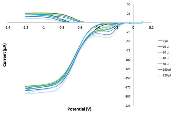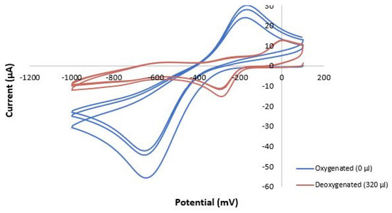 Figure 10 shows the RRDE voltammograms obtained after addition of aliquots to the voltaic cell containing DMSO bubbled with oxygen. The superoxide is initially generated as reduction of oxygen at the disk electrode, when subjected to sufficient negative potential, lower curve. The opposite reaction, oxidation of superoxide to oxygen, is obtained at the ring electrode, upper curve. Emodin was added in aliquots and the more the antioxidant was added, the less superoxide radical was detected at the ring electrode. In contrast with a previous study [22], there was an increase of current in the area −0.2–0.4 V. Therefore, a specific voltammogram for emodin, without O2 in the voltaic cell (e.g., purged with N2), was performed (Figure 11) and confirmed emodin reduction in the same area. The redox reaction is not entirely reversible, as indicated on the voltammogram, since the curve generated from the negative scanning is not the same as the curve from the positive scanning (Figure 11). The curves run close but do not overlap entirely. This observation is confirmed by the formation of a “loop” at the end of the disk portion, which is located at the most negative potential.