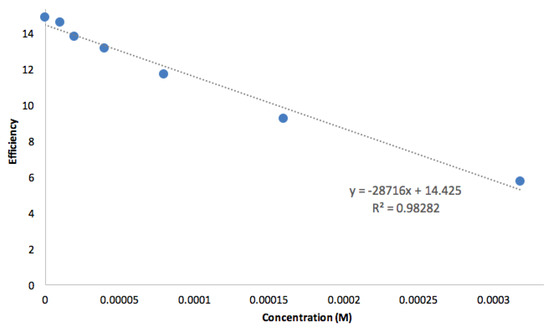 The collection efficiency (Figure 12) is obtained from the voltammogram of Figure 10 by dividing the I value at the ring and that at the disk for each added aliquot, against the concentration of the scavenger emodin in the solution. In a recent work by our group, the slope of the efficiency graph was correlated to the amount of several flavonoid hydroxyls engaged in scavenging the superoxide radical. This resulted in quercetin efficiency slope of −5.30 × 104, steeper than that of chrysin (−1.10 × 104), in correspondence of five hydroxyls of the former and twp of chrysin. According to DFT results, chrysin used only one hydroxyl for scavenging superoxide [22]. The emodin slope (−2.90 × 104) is greater than that of chrysin and smaller than for quercetin. These results agree with the theoretical calculations shown earlier, where two molecules of superoxide were sequestered by emodin; that is, more than chrysin and fewer than quercetin. Indeed, the number and location of hydroxyl groups are believed to affect the scavenging ability of antioxidants [23].