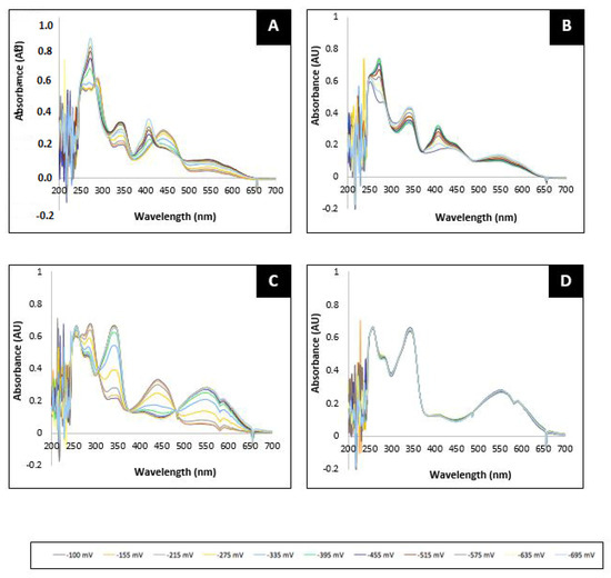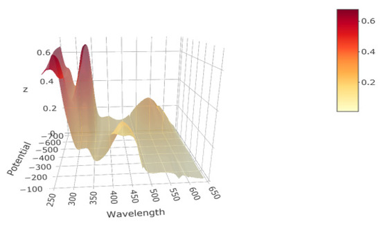 The variation of UV-Vis spectra of Figure 13 is better displayed in this 3D graph. It is shown that peaks 350 nm and 550 nm tend to disappear for more positive potential, meanwhile peak 450 nm increases in intensity. A dynamic 3D graph is deposited [24].