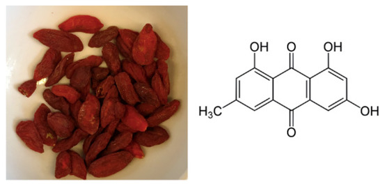 Traditional Chinese medicine (TCM) is an ancient set of practices that continues to influence the lives of many health seekers as an alternative to Western medicine. The use of natural, plant-based products in particular, is highly regarded in TCM. One plant that has a long history of usage in TCM is the goji berry (Lycium barbarum and Lycium chinense). They are widely cultivated in China for their range of health benefits, which include improved liver and kidney tonification and eyesight, elimination of toxins from the body, and an overall improvement in health and longevity [1]. Early goji berry references are from 200 BCE when it premiered as one of the top-grade herbs in Shen Nong Ben Cao Jing, an ancient book detailing Chinese medicinal and agricultural information [1]. Some recent studies show that goji berry has pharmacologic effects, including anti-aging, neuroprotection, immunomodulation, anti-tumor activity, and cytoprotection [2]. Some components of goji berry are E-cinnamic acid, flavonoids such as quercetin, coumarins, lignans, amides, and anthraquinones [3]. Some anthraquinones show activity against constipation, arthritis, multiple sclerosis, and cancer [3]. One of these anthraquinones in goji berry is emodin, also found in rhubarb (Rheum palmatum) and other Chinese medicinal herbs. Emodin has shown important biological properties as potent in vitro and in vivo anti-tumor activity, which suggests an important role for treatment of cancer [4]. In addition, emodin sensitizes resistant tumor cells to chemotherapeutic agents such as tumor necrosis factor (TNF)-related apoptosis-inducing ligands, as oxaliplatin, gemcitabine, adriamycin, cisplatin, capecitabine, paclitaxel, abiplastin, doxorubicin, and 5-fluorouracil. [5]. Among other biological effects, emodin prevents calcification stimulated during acute inflammatory response [6]. On the other hand, emodin reverses reactive oxygen species (ROS) in neutrophils derived from severe acute pancreatitis in rats [7]. Moreover, the effect of emodin in fibrotic lung injury is likely related to its favorable properties of anti-inflammation and anti-oxidation. For instance, it stimulates the Nrf2-antioxidant signaling process in damaged lungs [8]. Other biological effects of emodin are attributed to its antioxidant activity including an increase in the hepatic mitochondrial antioxidant condition of CCl4-intoxicated mice on emodin pretreatment [9]. In the area of food science, emodin’s antioxidant activity is of interest since anthraquinones, including emodin, were shown to be effective in the inhibition of linoleic acid peroxidation. The results suggest that the emodin antioxidant mechanism possibly involves scavenging of hydroxyl radicals [10].
