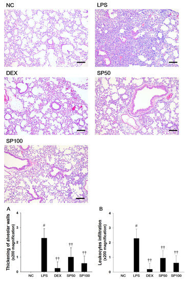 Effects of Spiraea prunifolia var. simpliciflora (SP) on airway inflammation in LPS-induced ALI mice. Histological examination of airway inflammation performed in the lung tissue by H&E staining. NC: normal control mice; LPS: LPS-induced mice; DEX: dexamethasone (3 mg/kg) + LPS-induced mice; SP 50: (50 mg/kg) + LPS-induced mice and SP 100: (100 mg/kg) + LPS-induced mice. Average pathologic scores of (A) thickening of alveolar walls and (B) leukocytes infiltration are expressed as the means ± SD (n = 7/group). # Significantly different from NC group, p < 0.05; †, †† significantly different from LPS-treated group, p < 0.05 and p < 0.01.