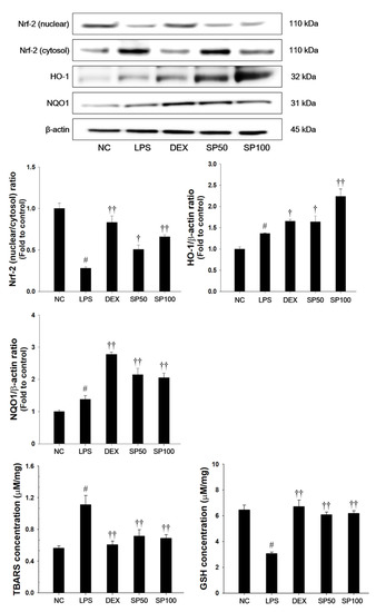 The cells (5 × 104 cells/well) were incubated with SP (0, 25, 50, and 100 μg/mL) for 1 h, followed by incubation in the presence of TNF-α (30 ng/mL). After 1 h incubation, the cells were washed with PBS (Gibco, San Diego, CA, USA). The cytoplasmic and nuclear fraction of cell was separated by using NE-PER Nuclear and Cytoplasmic Extraction Reagents (Thermo Scientific, Waltham, MA, USA) containing protease and phosphatase inhibitor cocktail. The protein concentration for each samples were determined while using a Bradford reagent (Bio-Rad Laboratories, Richmond, CA, USA). The expression levels of Nrf2, HO-1, and β-actin (loading control) were determined in triplicate (n = 3) while using immunoblotting, as described above.