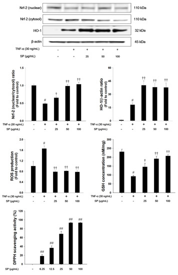 TNF-α treatment decreased the nuclear translocation of Nrf2, whereas HO-1 expression was increased in TNF-α-stimulated NCI-H292 cells, as shown in Figure 8. TNF-α-stimulated cells also exhibited a significant decrease in the GSH levels. However, treatment with SP significantly increased the translocation of Nrf2 into the nucleus with a concurrent increase of HO-1. The SP exhibited a significant decrease of ROS production and a significant increase of GSH and DPPH radical scavenging activity in a concentration-dependent manner.