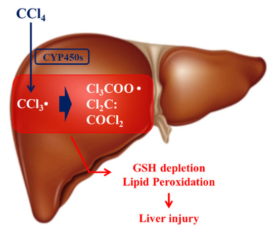 CCl4, a well-known experimental hepatotoxin, is reported to cause necrosis, apoptosis, fibrosis, cirrhosis, and cancer in the liver [15,16]. CCl4 is mainly metabolized by hepatic cytochrome P450s and is converted into toxic metabolites, such as trichloromethyl radical (CCl3•), trichloromethylperoxy radical (CCl3OO•), and phosgene (Figure 1), which results in lipid peroxidation that causes hepatocellular damage [15,16]. The reactive metabolites are detoxified non-enzymatically by the cellular antioxidant, glutathione (GSH) or by GSH S-transferase (GST)-catalyzed conjugation reaction [15,16]. However, the excessive generation of free radicals depletes the GSH levels and causes oxidative stress [15,16].