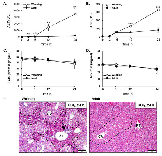 The weaning mice and adult mice exhibited differential susceptibility to CCl4 hepatotoxicity. The serum levels of ALT and AST, which indicate liver injury, in the weaning mice were found to be significantly higher than those in the adult mice post-CCl4 administration (Figure 2A,B). Total protein and albumin levels in serum, reflecting the biosynthetic function of the liver, did not show a significant difference in age-dependent changes as well as time-dependent changes for 24 h after CCl4 treatment (Figure 2C,D). The analysis of H&E-stained liver tissues indicated that the weaning mouse liver exhibited severe centrilobular necrosis at 24 h post-CCl4 injection, whereas the adult mouse liver exhibited mild liver injury (Figure 2E). This suggested that the weaning mice were more susceptible to CCl4-induced hepatotoxicity than the susceptibility observed in adult mice.