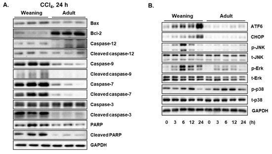 CCl4 is reported to induce hepatic cell death by apoptosis [15,26]. To comparatively evaluate the CCl4-induced hepatic apoptosis between weaning mice and adult mice, the expression levels of proteins involved in the apoptotic signaling pathway were determined at 24 h post-CCl4 injection. The weaning mice exhibited higher pro-apoptotic Bax hepatic levels and lower anti-apoptotic Bcl-2 hepatic levels than the ones exhibited by the adult mice (Figure 3A). Compared to the adult mice, the weaning mice exhibited higher hepatic levels of caspase-9 (initiator caspase) and caspase-7 (executioner caspase) and their active cleaved forms (Figure 3A). Although the hepatic levels of caspase-3 were not markedly different between the two groups, the weaning mice exhibited higher hepatic levels of cleaved caspase 3 (active form) than the levels exhibited by the adult mice (Figure 3A). The hepatic levels of PARP, which is cleaved by caspases, in the weaning mice were found to be higher than those in the adult mice (Figure 3A). These results indicate that CCl4 induces higher hepatic apoptosis in the weaning mice than the one induced in the adult mice. Endoplasmic reticulum (ER) stress is a cellular condition of disturbed ER homeostasis, which is characterized by the accumulation of unfolded proteins and misfolded proteins in the ER [27,28]. During ER stress, unfolded protein responses (UPRs) are activated to restore the ER functions. However, prolonged ER stress promotes apoptosis to remove the damaged cells [27,28]. Activating transcription factor 6 (ATF6) is a UPR sensor protein that is induced and activated in response to ER stress [27,28]. Treatment with CCl4 in a time-dependent manner increased the hepatic levels of C/EBP homologous protein (CHOP), an indicator of ER stress, and ATF6 in the weaning mice after CCl4 treatment. However, CCl4 treatment did not markedly affect the hepatic levels of CHOP and ATF6 in the adult mice (Figure 3B). Cellular stresses activate mitogen-activated protein kinases (MAPKs), which mediate the intracellular signaling involved in cell proliferation, differentiation, survival, and apoptosis [29,30]. Three MAPKs, namely JNK, Erk, and p38, are reported to be activated in response to toxic stimuli, such as oxidative stress and inflammation [29,30]. Treatment with CCl4 increased the hepatic levels of activated/phosphorylated forms of JNK, Erk, and p38 in both weaning mice and adult mice (Figure 3B). However, the weaning mice exhibited higher hepatic p-JNK and p-Erk levels than the ones exhibited by the adult mice. There was no significant difference in the hepatic p-p38 levels between the two groups. ER stress can activate JNK, which subsequently triggers apoptosis [27,28]. Thus, the enhanced activation of JNK in weaning mice may explain the ER stress-induced apoptotic cell death in the livers.