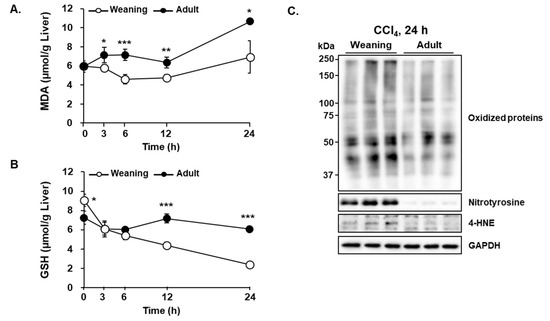 Carbon tetrachloride (CCl4)-induced oxidative stress in the liver of weaning mice and adult mice. Time-dependent changes in the (A) hepatic malondialdehyde (MDA) and (B) hepatic glutathione (GSH) levels. (C) The levels of oxidized proteins, nitrotyrosine-protein adducts, 4-hydroxynonenal (4-HNE) at 24 h post-CCl4 treatment. Male mice were injected with CCl4 (0.1 mmol/kg equal to 15.4 mg/kg, intraperitoneal (IP)). The liver tissues were obtained at 0 h, 3 h, 6 h, 12 h, and 24 h post-CCl4 treatment. The results have been presented as mean ± standard deviation (SD). *, **, *** Significantly different from the corresponding weaning mice (Student’s t-test, p < 0.05, p < 0.01, and p < 0.001, respectively).