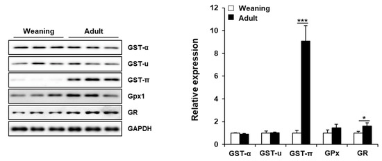 GSTs catalyze the detoxification reaction by conjugating GSH with the electrophiles [31]. The hepatic levels of GST-α and GST-µ classes were similar between the weaning mice and adult mice. However, the hepatic levels of GST-π class in the adult mice were about 9-fold higher than those in the weaning mice. This suggested that the liver of adult mice may exhibit higher GST-π-mediated detoxification, that can also be a reason for the lower basal level of GSH in these mice as GSH is consumed by GSTs. The levels of GPx, which reduces lipid peroxides and H2O2 using GSH [32], were significantly different between the two groups. However, the hepatic levels of GR, which converts oxidized GSH (GSSG) to reduced GSH [32], in the weaning mice were lower than those in the adult mice. This can also explain the enhanced vulnerability of weaning mice to oxidative stress (Figure 6).