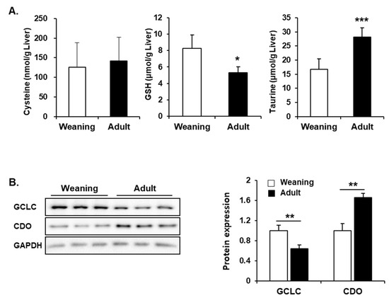 As described previously, the weaning mice exhibited higher hepatic GSH levels that the adult mice even without CCl4 treatment (Figure 4B and Figure 7A). To examine the GSH synthetic pathway, the hepatic levels of cysteine (precursor of GSH) and GCLC (rate-limiting enzyme for GSH synthesis) were comparatively evaluated between the weaning mice and adult mice. There was no significant difference in the hepatic cysteine level between the two groups. The hepatic GCLC levels in the weaning mice were higher than those in the adult mice (Figure 7B). Interestingly, the hepatic levels of taurine (another metabolic product from cysteine) and CDO (the first enzyme utilizing cysteine for taurine synthesis) in the weaning mice were significantly lower than those in the adult mice (Figure 7A,B). Therefore, the higher rate of GSH synthesis and the lower consumption of cysteine for taurine production may contribute to the enhanced hepatic GSH level in the weaning mice.