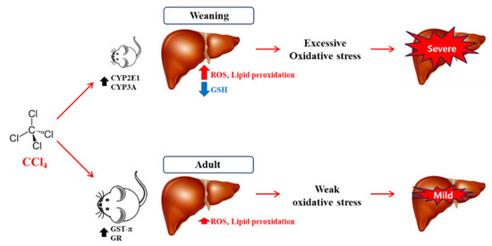 Summary and hypothetical mechanisms of age-related susceptibility to carbon tetrachloride (CCl4) hepatotoxicity in weaning mice and adult mice. Higher metabolic rate of CCl4 by hepatic CYP2E1 and CYP3A in weaning mice can cause excessive oxidative stress via reactive oxygen species (ROS) generation and glutathione (GSH) depletion, which can lead to significant liver injury. However, adult mice exhibit less CYP levels and high levels of GST-π and GR in their livers. This can contribute to resistance to CCl4 hepatotoxicity.