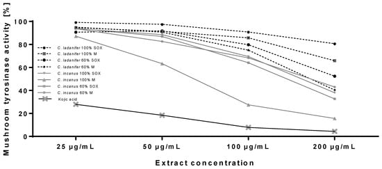 Inhibition of mushroom tyrosinase by C. incanus and C. ladanifer extracts in comparison with kojic acid; data on graphs represent mean values (n = 3).