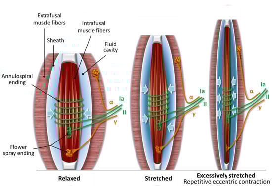 Colon et al. [6] formulated a detailed description of the muscle spindle. Muscle spindles contain intrafusal muscle fibers with sensory, gamma-motoneuron (γ-MN) [7,8,9], and sympathetic innervation [10]. Their main function is proprioception, and through this information, an internal representation of the body’s position and movement to the brain is provided, meaning also the global sense of ourselves [11]. “Upon a change in muscle tension, the muscle spindles send signals through afferent sensory neurons which are relayed to neurons within the spinal cord. Motoneurons receiving afferent information can then signal intrafusal or extrafusal fibers to relax or contract in response to sensory input [7]. With the afferent sensory feedback, the reflex arc acts as an automated closed loop so that voluntary movement can be achieved accurately and properly” [6].