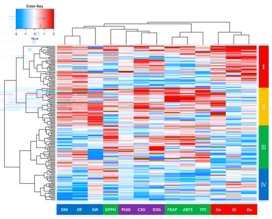 The 172 KBSL were classified into four clusters according to their agricultural traits, phytochemicals, and antioxidant activities (Table 5 and Figure 3). Cluster I contained 47 KBSLs and had high isoflavone contents and the long DMs compared to the other clusters. Cluster II had 42 KBSLs and showed high anthocyanin contents, high antioxidant activities, long DFs and DMs, and high SWs. Cluster III consisted of 48 KBSLs and showed the lowest isoflavone content, high antioxidant activities, and lowest SWs. Cluster IV had 35 KBSLs with the lowest anthocyanin content and antioxidant activities.