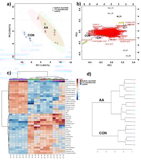 Analysis of treated C2C12 cells with ascorbic acid and with ascorbate 100 µM. (a) Principal component analysis (PCA) scores plot, where each dot represents a sample analysis (thus, 6 dots per experiment resulting from biological triplicates and technical duplicates); (b) PCA biplot visualizes which metabolites contribute most to the separation of the experimental groups; (c) heatmap visualizing the top 40 most differentiating metabolites. Color coding indicates greater deviation from the mean of all samples for a particular metabolite; (d) dendrogram indicating the degree of similarity among samples, constructed on the basis of all 204 metabolites. The analysis was performed using MetaboAnalyst V4.0.