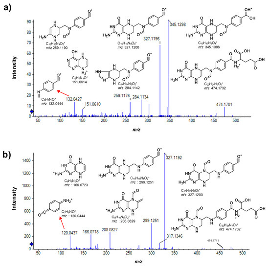 Positive ion mode MS/MS spectra of the two detected formyl-tetrahydrofolate (THF) isomers and the proposed structures of their fragment ions (CE 35 V; CES of 15 V). (a) 10-formyl-tetrahydrofolate (10-formyl-THF) and (b) 5-formyl-tetrahydrofolate (5-formyl-THF, authentic standard). Peak labels denote accurate masses and fragment ion m/z values denote exact masses.