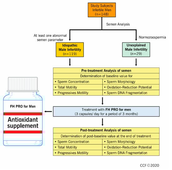 A physician specializing in male infertility obtained a full medical history from each study participant, and performed a physical examination (general and local genital) on each participant. Standard semen analysis, SDF, and seminal oxidation-reduction potential (ORP) were evaluated at the beginning of the study. Patients were prescribed to take three capsules of the antioxidant formula “FH PRO for Men” (Fairhaven Health LLC, Bellingham, WA, USA) twice a day for three months, which provides the following amounts of these nutrients per day: vitamin A (as beta-carotene): 5000 IU, vitamin C: 120 mg, vitamin D3: 1200 IU, vitamin E (as mixed tocopherols): 200 IU, vitamin K: 80 µg, thiamin: 3 mg, riboflavin: 3.4 mg, niacin: 20 mg, vitamin B6: 25 mg, folate: 800 µg, vitamin B12: 1000 µg, biotin: 600 µg, pantothenic acid: 20 mg, iodine: 150 µg, zinc: 30 mg, selenium: 140 µg, copper: 1 mg, manganese: 2 mg, chromium: 120 µg, molybdenum: 75 µg, l-carnitine tartrate: 2000 mg, l-arginine: 350 mg, CoQ10: 200 mg, N-acetyl l-cysteine: 200 mg, grapeseed extract: 20 mg, lycopene: 10 mg, and benfotiamine: 1 mg. Thorough monitoring of the patients’ compliance with the medication was done through bi-weekly phone call follow-up. After finishing the three months of treatment, patients were examined again, and semen analysis, SDF, and ORP were reassessed.