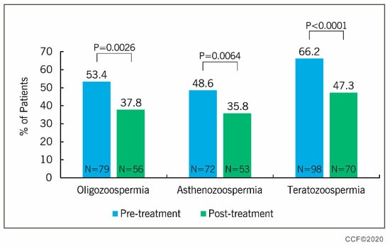 Outcome of FH PRO treatment on infertile men (n = 119) with oligozoospermia (sperm concentration <15 × 106/mL), asthenozoospermia (total motility <40%), and teratozoospermia (normal sperm morphology <4%). McNeamar test was used to calculate the percent change.