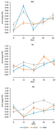 Dynamics of the ascorbic acid (AsA) in calli deriving from explant of fruits at the mature green (MG), turning (TR), and red ripe (RR) stage. For each source of explants, the graph reports the mean and standard deviation in the different genotypes from 0 to 60 days of tissue culture.