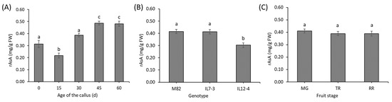 Main effect of the age of the callus (A), genotype (B) and stage of the fruit used for the tissue culture explants (C) on the rAsA content. For each panel, different letters (a–c) represent statistically significant differences (p ≤ 0.05).