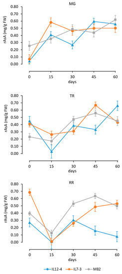 The dynamics of the rAsA accumulation during callus growth for the different sources of explants (fruits at the MG, TR or RR stage) is presented in Figure 5. Differences in rAsA content among the genotypes were less pronounced compared to the AsA. A trend similar to the AsA accumulation was present principally for the MG and RR stages. For the various explants, differences among the genotypes at the latest time point (60 days) were not present, except for the IL12-4 calli deriving from red ripe fruits.