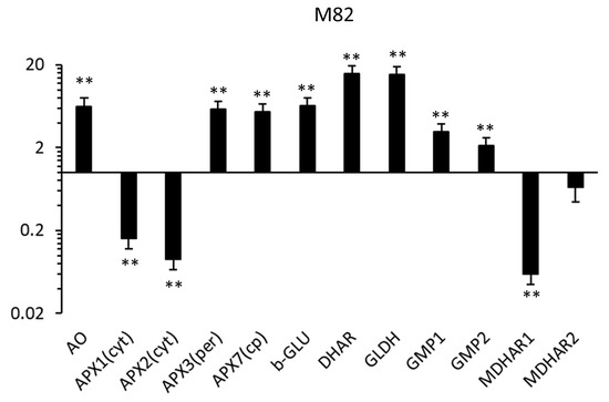 Among the genes involved in AsA biosynthesis, the two GMPs under investigation were overexpressed in the three genotypes. The GLDH was significantly upregulated in M82 and IL7-3 and its relative increase in IL12-4 was just below 2-fold (and not statistically significant). At cellular level, the ascorbic acid pool undergoes a continuous recycling due to a continuous oxidation and reduction. The ascorbate oxidase (AO) gene was another gene overexpressed in the calli of the three genotypes. However, the transcriptional profile of the other genes involved in ascorbate oxidation (i.e., the four ascorbate peroxidases, APXs) was complex, also because the three genotypes showed a different response to the tissue culture.