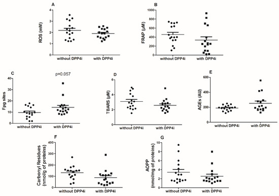 Scatter dot plot of reactive oxygen species (ROS) (panel A), ferric reducing ability of plasma (FRAP) (panel B) Fpg sites (panel C) thiobarbituric acid reactive substances (TBARS, panel D), advanced glycation end products (AGEs) (panel E), carbonyl residues (panel F), and advanced oxidation protein products (AOPP) levels (panel G) in type 2 diabetes mellitus (T2DM) patients with and without treatment with dipeptidyl peptidase-4 inhibitors (DPP4i). Comparison of continuous variables between matched pairs were performed using the paired t-test (when data were normally distributed) or Wilcoxon test (when data were non-normally distributed).