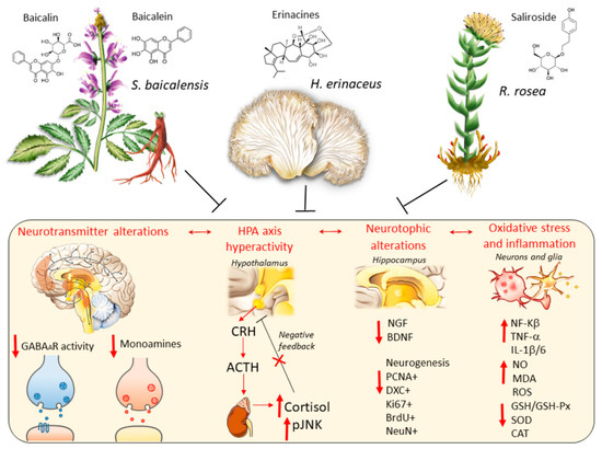 A general view on the mechanisms of action of S. baicalensis, H. herinaceum and R. rosea against the main biological pathways that are altered in depression and depressive-like behavior (yellowish box). Hypotheses on the neurobiology of depression and anxiety are largely based on dysregulations of (i) neurotransmitter systems, including GABA and GABAA receptors [8], as well as monoamines (dopamine, norepinephrine and serotonin) [9]; (ii) hypothalamic-pituitary-adrenal (HPA) axis consisting of an abnormal release of corticotropin-releasing factor (CRH), adrenocorticotropin (ACTH) secretion from the anterior pituitary, abnormal secretion of glucocorticoids (cortisol in humans and corticosterone in rodents), activation of phosphorylated c-Jun kinase (pJNK), and aberrant negative feedback HPA axis [9]. (iii) impaired neurotrophic mechanisms consisting of low expression of nerve growth factor (NGF) and brain-derived neurotrophic factor (BDNF), impaired neurogenesis and plasticity [9]; (iv) chronic oxidative stress and neuroinflammation [10]. Black T-shaped lines indicate inhibition. Red bold arrows indicate downregulation or hyperactivation. Red thin arrows indicate sequential molecular events.