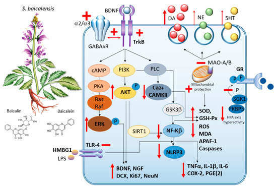 S. baicalensis: molecular mechanisms underlying neuroprotection and anxiolytic/antidepressant-like effects. By acting as MAO A/B inhibitors, S. baicalensis and its bioactive ingredients (mostly baicalin and baicalein) induce monoamine, and mostly DA release. At the same time, they act as partial, subtype-selective GABAA receptor ligands and also foster the interaction of GABAA receptors with TrkB to potentiate GABA-induced signaling. By increasing cAMP/pERK and PI3K/pAKT signaling, they promote the synthesis of neurotrophic factors (BDNF and NGF) as well as neurogenesis. S. baicalensis promotes anti-inflammatory effects through inhibition of HMBG1/TLR4/NF-k, AKT/SIRT1/NF-k, and GSK3/NF-k axes. This leads to a reduction in NLRP3 and proinflammatory cytokines levels. At the same time, S. baicalensis promotes anti-oxidant effects which are bound to both Ca2+/CAMKII pathway inhibition and mitochondrial protection. By downregulating SGK1 and FKBP5, S. baicalensis also counteracts alterations in glucocorticoid receptors (GR) associated with phosphorylation of its crucial serine residues and HPA axis hyperactivity.