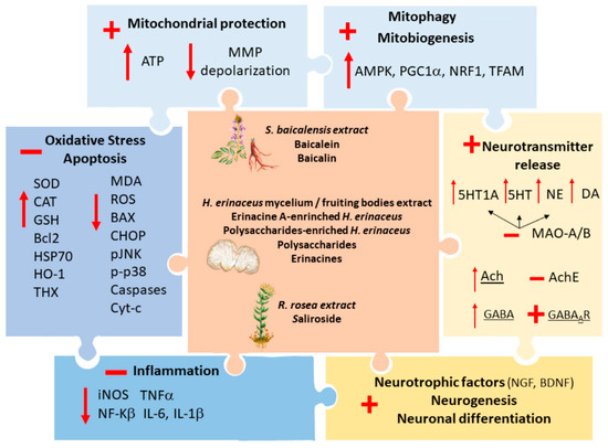Mechanisms underlying the neuroprotective effects of S. baicalensis, H. erinaceus and R. rosea. The neuroprotective effects of S. baicalensis, H. erinaceus and R. rosea, administered as either full/enriched herbal extracts and/or as single bioactive ingredients (central box), are bound to antioxidant, mitochondrial-protecting, anti-inflammatory, neurotransmitter release-stimulating and neurotrophic/neurogenic activities. These effects are here represented as pieces of a puzzle where S. baicalensis, H. erinaceus and R. rosea perfectly fit in the middle. Antioxidant properties of these compounds consist of reducing the levels of reactive oxygen species (ROS), enhancing superoxide dismutase (SOD), glutathione (GSH) and catalase (CAT) activities along with heat shock proteins 70 (HSP70), heme oxygenase-1 (HO-1) and thioredoxin (THX) levels, while decreasing lipid peroxidation (malondialdehyde, MDA, content) and counteracting apoptosis through reduction of Bax, C/EBP Homologous Protein (CHOP), pJNK, pp38, caspases 3, 6 and 9, and cytochrome-c release. These effects are closely associated to mitochondrial protection, namely improvement of mitochondrial membrane potential (MMP) depolarization and ATP production, and concomitant enhancement of mitophagy and mitochondrial biogenesis via increasing 5’ AMP-activated protein kinase (AMPK), Peroxisome proliferator-activated receptor gamma coactivator 1-alpha (PGC1α), Nuclear respiratory factor 1 (NRF1) and Mitochondrial transcription factor A (TFAM). At the same time the three herbs promote anti-inflammatory effects by decreasing NF-kβ and iNOS enzymes levels while inhibiting the release of pro-inflammatory cytokines TNF-α, IL-6 and IL-1β. These herbs also target alterations of neurotransmitter systems, by enhancing the release of monoamine through MAO inhibition, acetylcholine (Ach) via inhibition of acetylcholine esterase (AchE), and GABA-induced inhibitory currents by promoting stimulation of GABAA receptors.