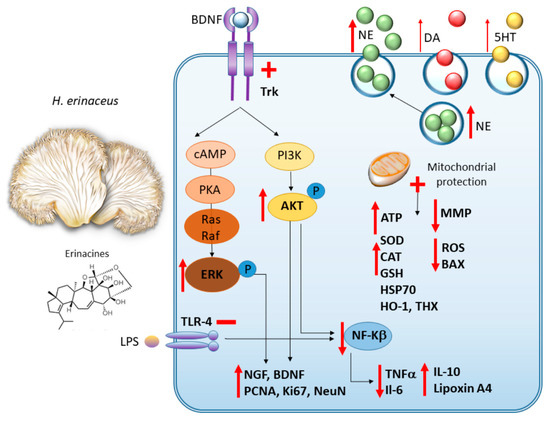 H. erinaceus: molecular mechanisms underlying neuroprotective and antidepressant-like effects. H. erinaceus and its bioactive ingredients (mostly erinacines) potentiate monoamine, and mostly norepinephrine (NE) synthesis and release. At the same time, they promote TrkB-related increase in pERK and pAKT and the subsequent synthesis of neurotrophic factors (BDNF and NGF) along with neurogenesis. H. erinaceus promotes anti-inflammatory effects through inhibition of TLR4/NF-kb, PI3K/AKT/Nf-κB axes. H. erinaceus also protects from apoptosis, mitochondrial damage and promotes anti-oxidant effects.