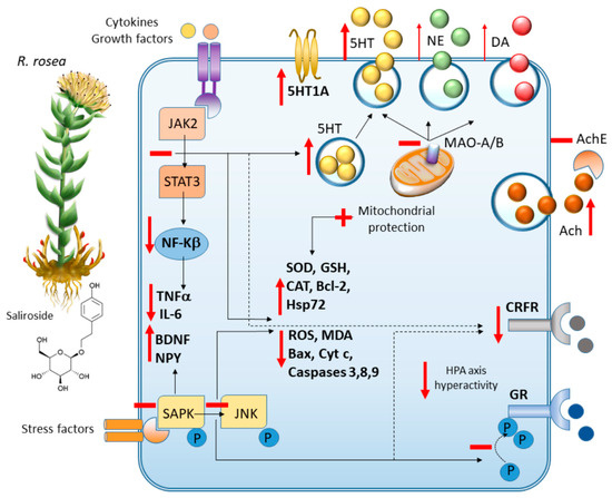 R. rosea: molecular mechanisms underlying neuroprotective, cognitive enhancing and anxiolytic/antidepressant-like effects. By acting as MAO A/B inhibitor, R. rosea and its main bioactive ingredient (saliroside) induce monoamine, and mostly 5-HT release while potentiating 5-HT synthesis and the expression of 5-HT1A receptors. R. rosea also potentiates Ach release while acting as an Ach esterase (AchE) inhibitor. At the same time, R. rosea acts as a JAK/STAT and SAPK/JNK pathway inhibitor to promote the synthesis of neurotrophic factors along with anti-inflammatory and antioxidant effects. JAK/STAT and SAPK/JNK pathway inhibition is also associated with R. rosea-induced downregulation of CRF receptors and inhibition of GR phosphorylation at crucial serine residues related to HPA axis activity.