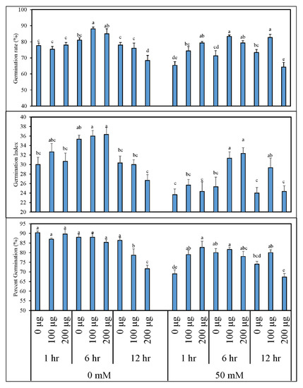 Percentage germination (%), germination rate (%), and germination index of tomato after seed priming with different concentrations of aqueous garlic extract (AGE). Tomato seeds were primed with 0, 100, and 200 µg∙mL−1 AGE for 1, 6, and 12 h and germinated under 0 and 50 mM NaCl stress. Obtained data were subjected to analysis of variance (ANOVA) using factorial design. Differences among the means were calculated with Tukey’s honestly significant difference (HSD) (p = 0.05). Means followed by the same letters bear no significant difference.