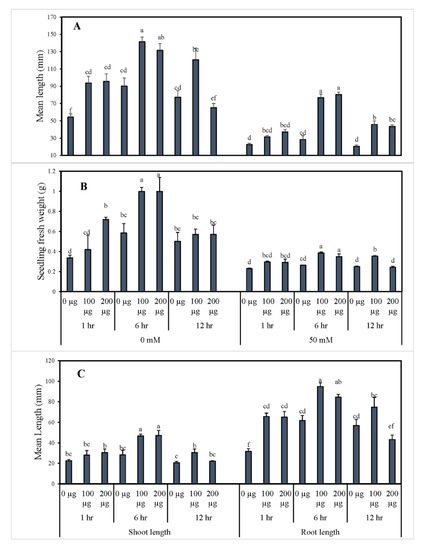 Morphological indices of tomato seedlings obtained from seed priming with AGE. Tomato seeds were primed with 0, 100, and 200 µg∙mL−1 AGE for 1, 6, and 12 h and germinated in 0 and 50 mM NaCl stress conditions. Obtained data were subjected to analysis of variance (ANOVA) using factorial design. Differences among the means were calculated with Tukey’s HSD (p = 0.05). Bars represent mean values and standard errors for four replicates (10 seedlings per replicate). Means followed by the same letters bear no significant difference.