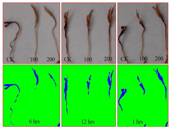 To identify the stress level, 3,3′-diaminobenzidine tetrahydrochloride (DAB) staining was used to determine the content of H2O2 in the treated seedlings. Randomly selected seedlings were placed in glass test tubes and immersed in DAB solution for measuring H2O2. Staining solution was drained after overnight inoculation. Chlorophyll was removed by treating with ethanol and heating in hot boiling water for 10 min. H2O2 was then observed as a reddish-brown stain after transferring to a paper towel with 60% glycerol [29]. Photographs were taken using a Nikon digital camera, and the abundance of H2O2 was determined digitally by analyzing the pictures using ImageJ following a published procedure [30].